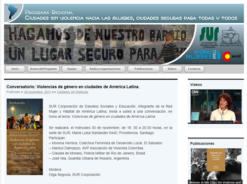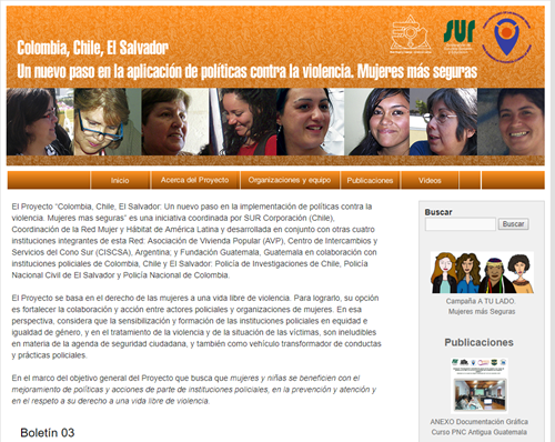 El Proyecto “Colombia, Chile, El Salvador: Un nuevo paso en la implementación de políticas contra la violencia. Mujeres mas seguras” es una iniciativa coordinada por SUR Corporación (Chile), Coordinación de la Red Mujer y Hábitat de América Latina y desarrollada en conjunto con otras cuatro instituciones integrantes de esta Red: Asociación de Vivienda Popular (AVP), Centro de Intercambios y Servicios del Cono Sur (CISCSA), Argentina; y Fundación Guatemala, Guatemala en colaboración con instituciones policiales de Colombia, Chile y El Salvador: Policía de Investigaciones de Chile, Policía Nacional Civil de El Salvador y Policía Nacional de Colombia.