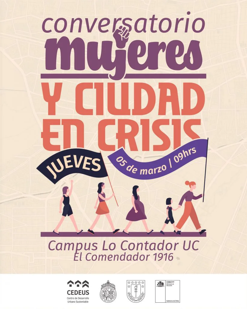 EN EL MARCO DEL DÍA INTERNACIONAL DE LA MUJER, EL CENTRO DE DESARROLLO URBANO SUSTENTABLE, INVITA AL CONVERSATORIO MUJERES Y CIUDAD EN CRISIS EN EL CAMPUS LO CONTADOR UC EL JUEVES 5 DE MARZO. LA INVITACIÓN ES A REFLEXIONAR EN TORNO A CÓMO IMPACTA LA CIUDAD EN LA CALIDAD DE VIDA DE LAS MUJERES Y A PENSAR LA CIUDAD INTEGRANDO SUS NECESIDADES.