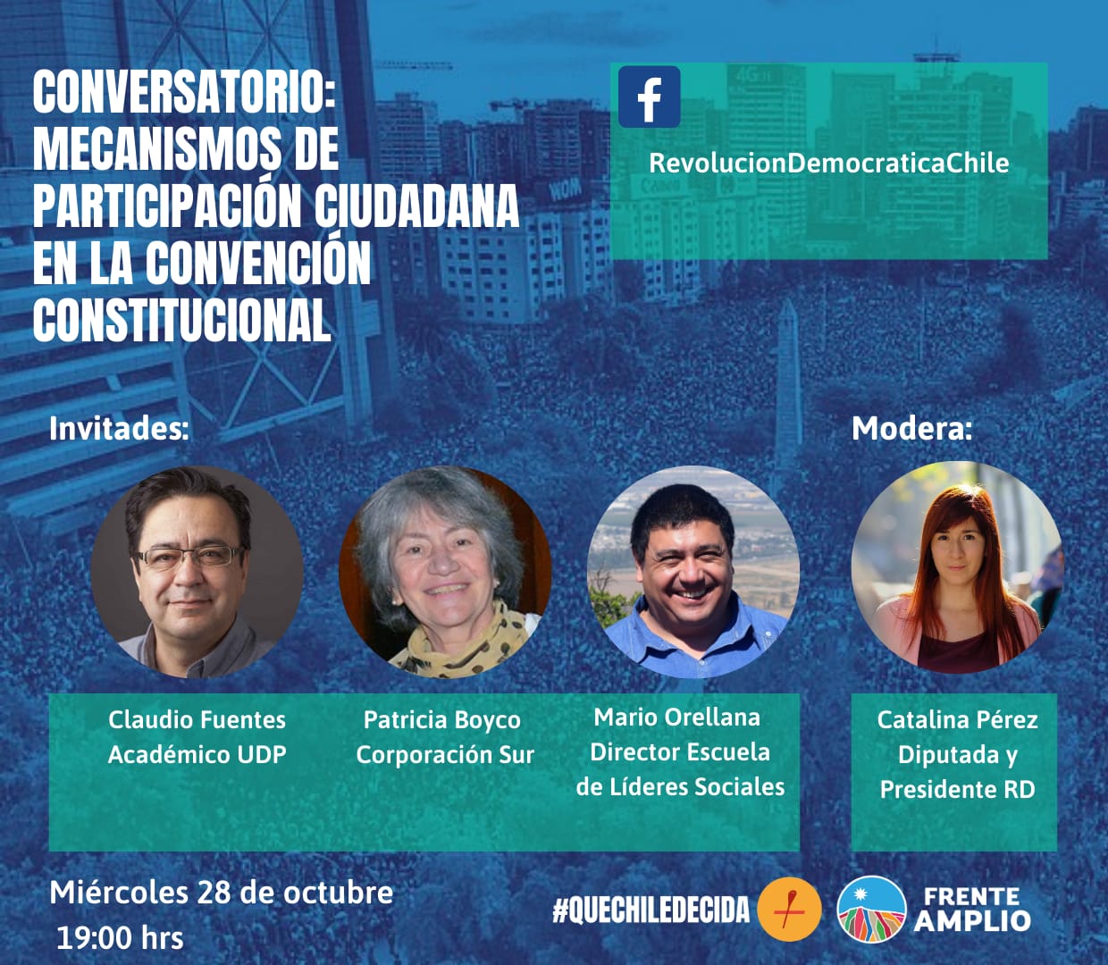 Les compartimos un Conversatorio sobre la Participación Popular en la Convención Constitucional, que contará con la presencial de Patricia Boyco, Claudio Fuentes, Mario Orellana y Catalina Pérez y será transmitido abiertamente por el Fanpage de Revolución Democrática este miércoles 28 de octubre a las 19:00. Las y los esperamos a todos, la participación es abierta!