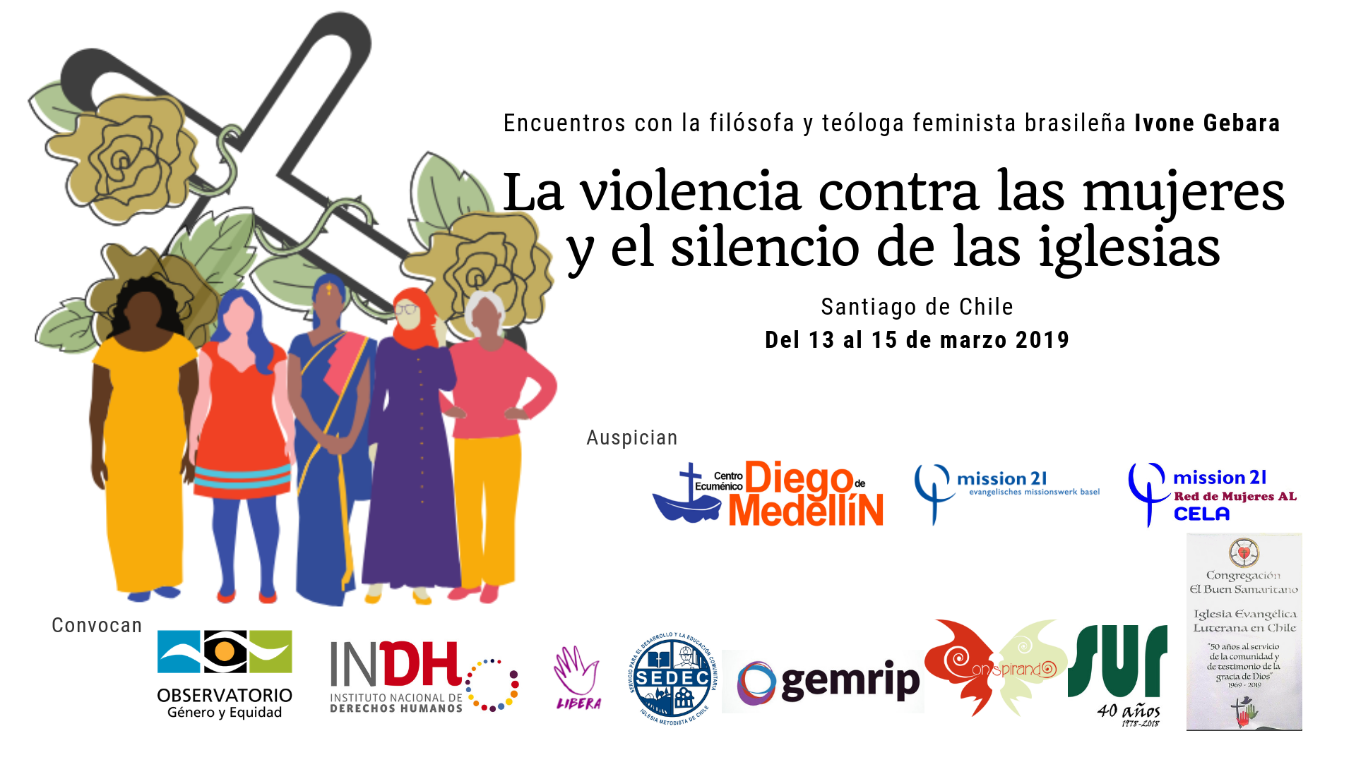Convocan: Instituto Nacional de Derechos Humanos (Sede Regional Metropolitana), Centro Ecuménico Diego de Medellín, Misión 21, Observación de Género y Equidad, Libera, Cons-pirando, Servicio para el Desarrollo y la Educación Comunitaria, Sedec, Grupo de Estudios Multidisciplinarios sobre Religión e Incidencia Pública, Gemrip, y corporación Sur