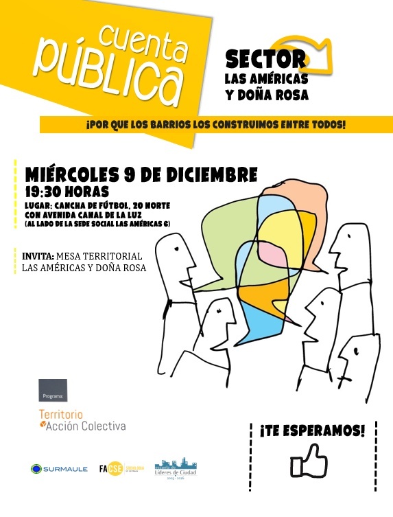 Cuenta Pública: La Mesa de Trabajo de Las Américas/Doña Rosa se apresta a entregar su primera Cuenta Pública a vecinos, vecinas, organizaciones sociales y territoriales del sector. La actividad, que contará con la asistencia de autoridades y representantes de otras mesas territoriales de Talca, se llevará a cabo el próximo miércoles 9 de diciembre, a las 19:30 horas, en la sede social de Américas VI.