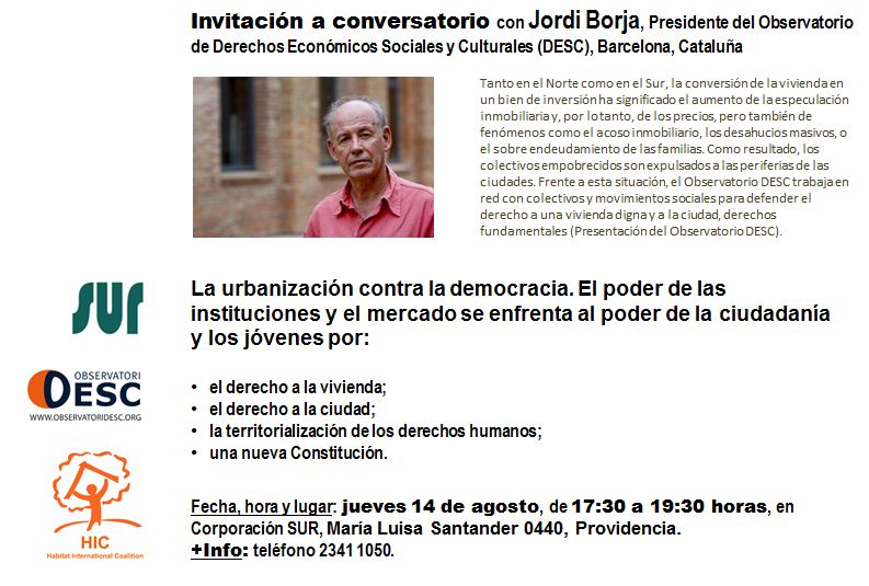 [PARA AGENDAR Y DIFUNDIR]: Invitación a conversatorio con Jordi Borja, Presidente del Observatorio de Derechos Económicos Sociales y Culturales (DESC), Barcelona, Cataluña 14 agosto, 2014 by SUR
