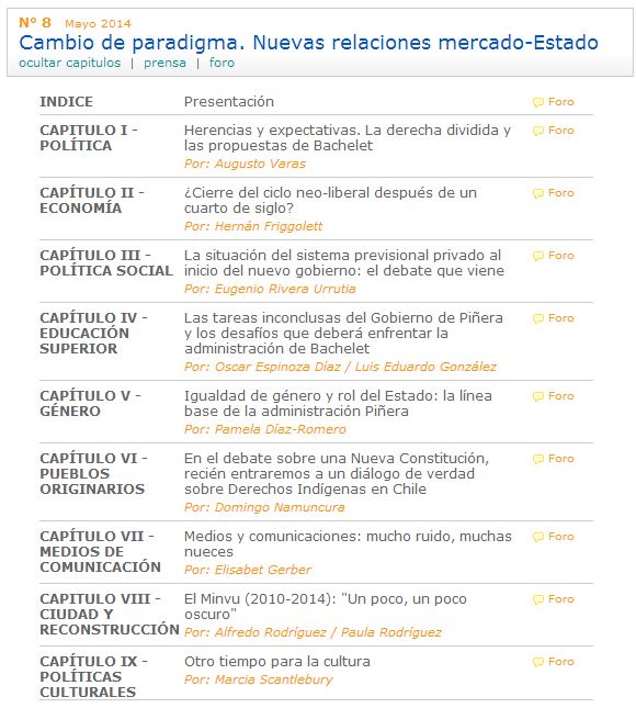 Este octavo número semestral reflexiona sobre este proceso, analiza la herencia dejada por la administración Piñera, establece las líneas de base con que se inicia el actual gobierno, identificando las tareas pendientes y los desafíos para su programa de gobierno.