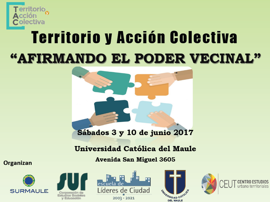 El Programa TAC convoca a integrantes activos de tres Mesas Territoriales de Las Américas/Doña Rosa, Territorio 5 y Unidad Vecinal 46 de Talca, al Ciclo Formativo “Afirmando el Poder Vecinal”, por realizarse en dependencias de la Universidad Católica del Maule, los días sábado 3 y sábado 10 de junio del presente año.