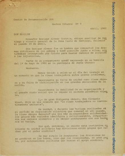 Reseña del pensamiento de Monseñor Enrique Alvear Urrutia, Obispo Auxiliar de Santiago, fallecido el pasado 29 de abril de 1982 Vol. 09