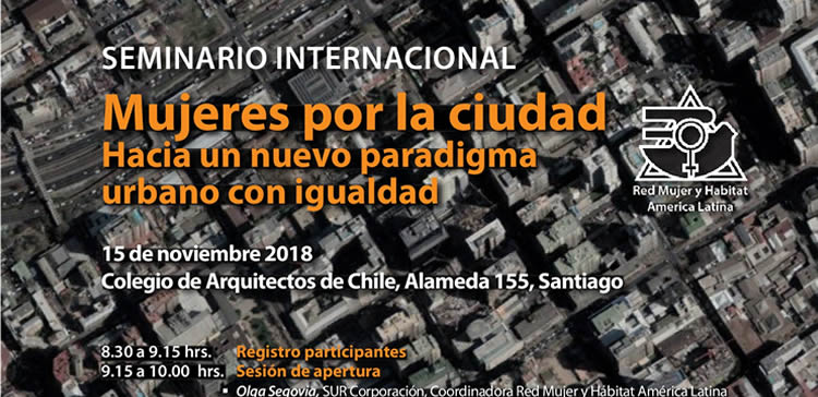 SUR Corporación, en representación de la Red Mujer y Hábitat América Latina, le invita al Seminario Internacional Mujeres por la ciudad. Un nuevo paradigma urbano con igualdad. Se llevará a cabo el día jueves 15 de noviembre, entre las 9:00 y las 19:30 horas, en la sede del Colegio de Arquitectos de Chile, Alameda 115, Santiago.