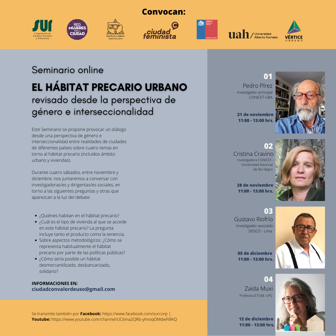 Este Seminario se propone provocar un diálogo desde una perspectiva de género e interseccionalidad entre realidades de ciudades de diferentes países sobre cuatro temas en torno al hábitat precario (incluidos ámbito urbano y viviendas).