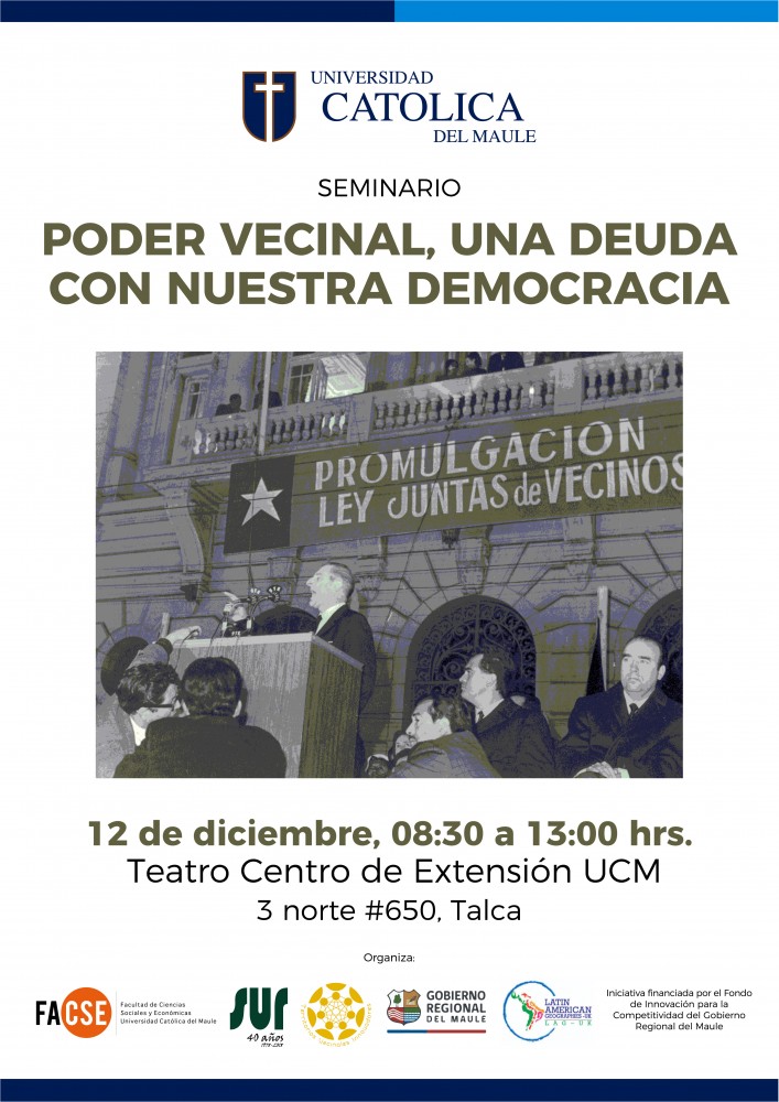 SEMINARIO PODER VECINAL UNA DEUDA CON NUESTRA DEMOCRACIA 17 diciembre, 2018 by SUR Talca, 12 de diciembre – Centro de Extensión UCM (Calle 3 Norte #650) Adjuntos: Invitación_seminario_Poder_Vecin.pptx Programa_Seminario_Poder_Vecinal.pdf